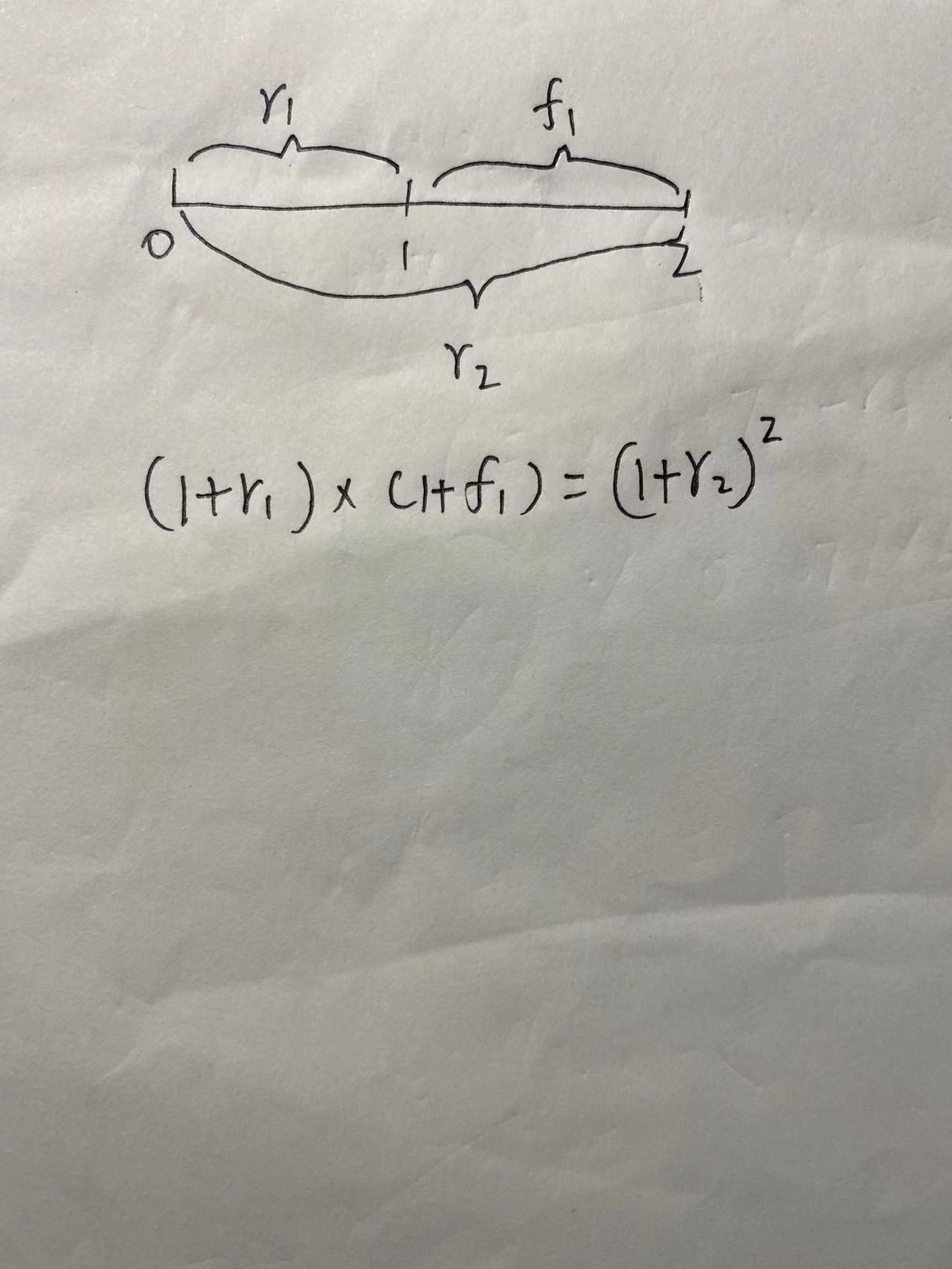 比如,1年期spot rate 为S1,2年期spot rate 为S2,第二年初到第二年末的利率为远期利率F1,他们之间的关系如下