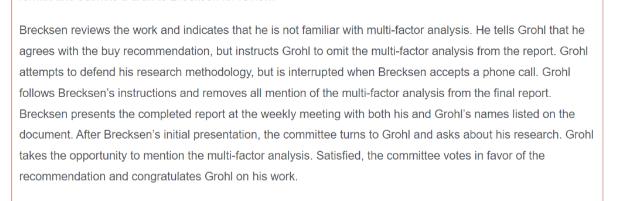 Grohl通过勤勉尽责地进行多因子分析,并且结合Brecksen之前的研究报告为基准得出结论,也得到了Brecksen的认可,此时将多因子分析部分删去以配合公司的top-down分析策略是不违规的。本题选A