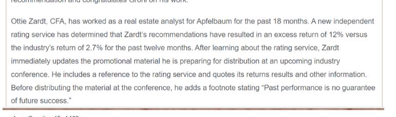 一个新的独立评级公司认为Zardt的推荐带来12%的超额收益并远超行业水平,而Zardt在未确认消息是否公正、精确与完善的情况下就将其加入发放的材料中,因此是违规的,本题选B。