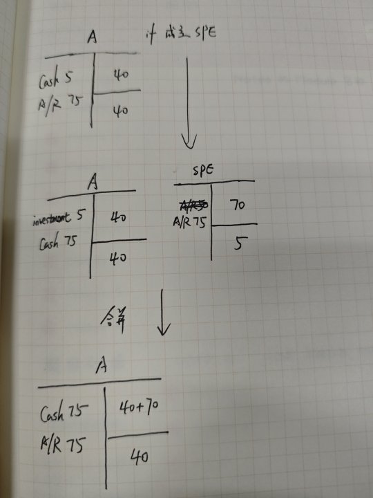 第三题,竟然是spe就应该合并报表,母公司出资5million成立spe,spe借70,买了母公司75的A/R,那母公司的现金增加70,长期股权投资增加5,A/R减少75;SPE的资产端增加75A/R,负债增加70;两者需要合并,合并后母公司现金70,长期股权投资5,A/R也要合并回到母公司的资产负债表,如此母公司报表不就多了(70-5)的current asset吗?不就是current asset增加了吗?
