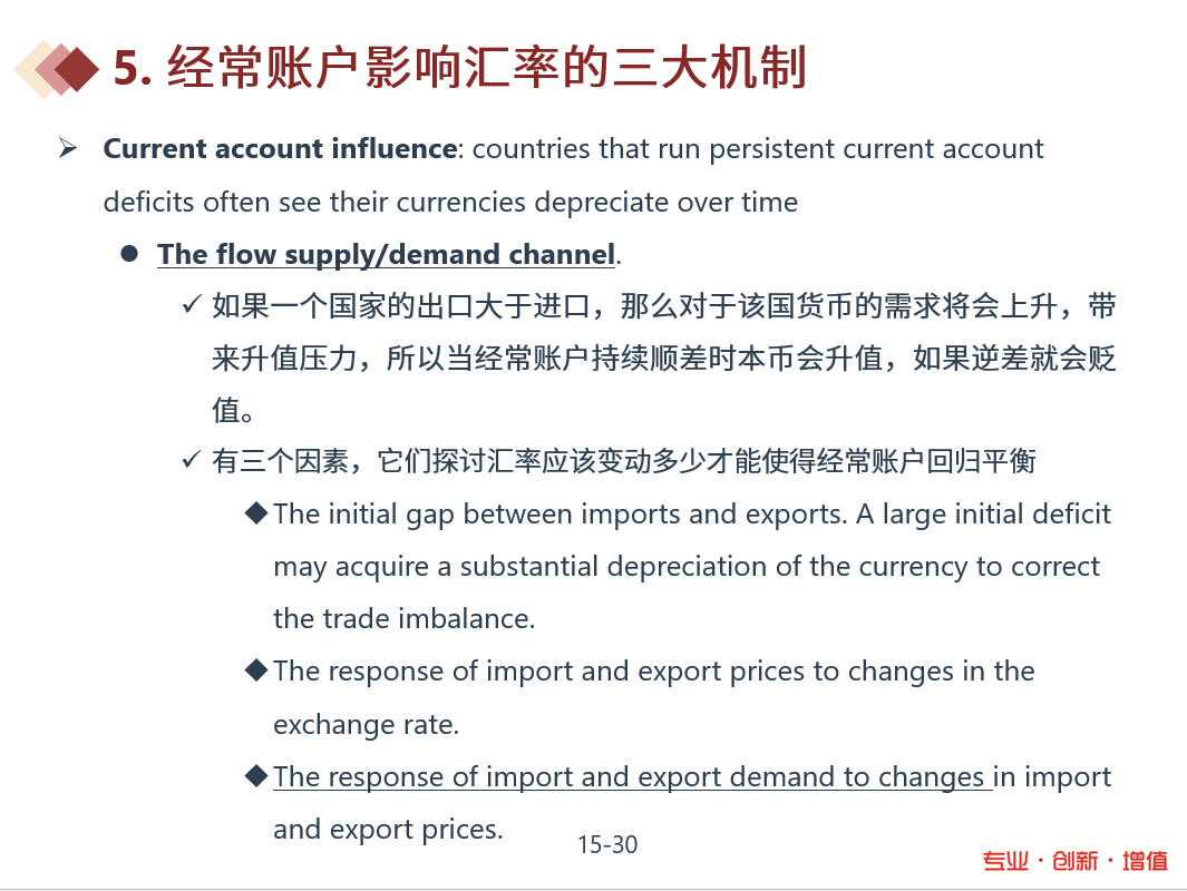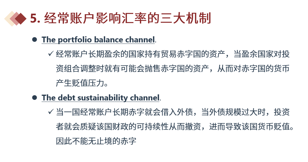 同学你好,经常账户赤字上升所带来的本币贬值是市场所决定的,并不是国家自己主动想贬值。经常账户可以通过三个机制来影响汇率,参考下图,他们都能解释为什么经常账户盈余会导致货币升值,而赤字则导致货币贬值。