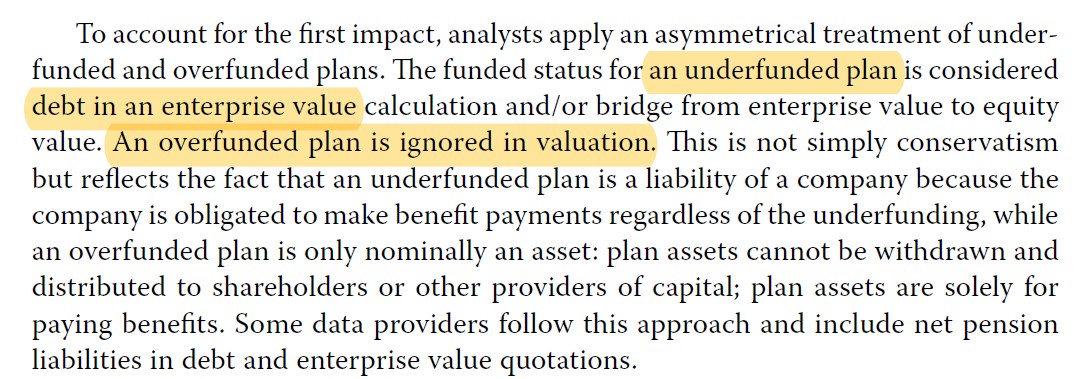 然后计算equity value时,如果是unfunded,那么视为负债,那么要从公司价值中减去,如果是overfunded,那么忽略