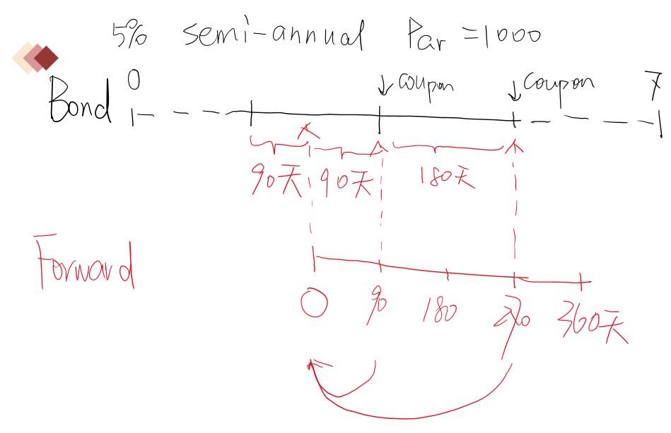 将远期合约0-360天合约存续时间段找到,对应好两笔coupon黑色,折现的时间段分别是两个红色的箭头所指90和270天