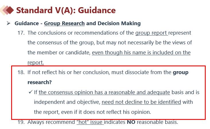 老师说CFA规定只要方法达成一致,结果可能不一致也不影响作者之一去署名。这意思是如果这两人用的都是基本面分析,一个人得出的结论是buy而另一个人得出sell,也都可以署名?还有,这是CFA哪条准则说的?