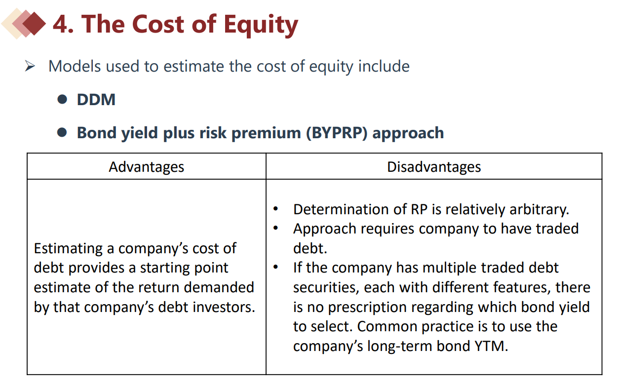 bond yield plus risk premium (BYPRP) approach基础课里面讲过的,是re = rd + RP,在债券的回报率上加上risk premium。