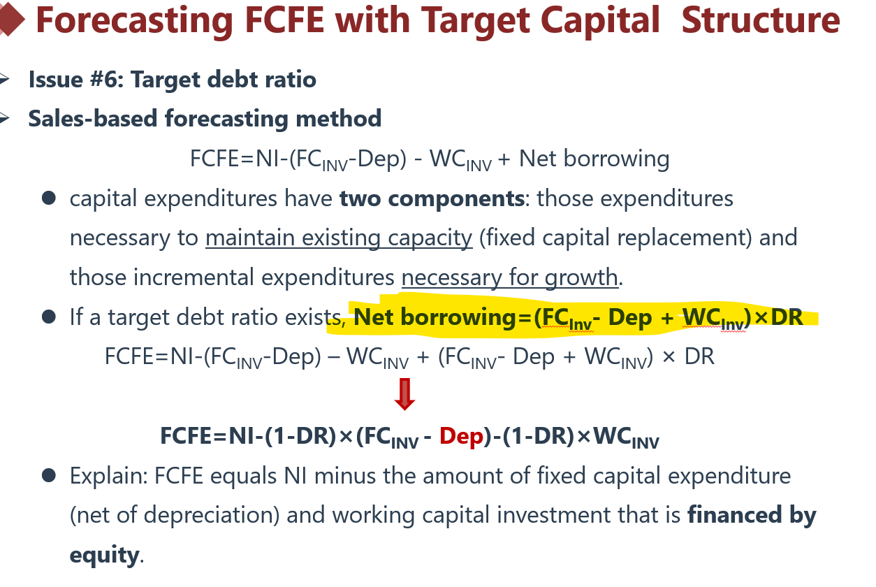 这里的DR=D/D+E,debt ratio 指的是最优资本结构下的负债比率,最优资本结构化下的debt权重。如果公司想要保持最优资本结构,就需要保证每一笔投资的资本结构都符合最优资本结构,因此NB就相当于新增投资*DR。新增投资为(FCinv-DEP)+WCinv,此时NB就是新增投资中需要借债的部分,因此我们得出了NB=(FC+WC-D&A)*DR,