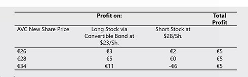 当股价下降到26时,你能够通过成本为23的可转债获得股票,此时可转债获利3元;同时做空股票也会获利,因为股价下降了,获利2(28-26=2),因此总获利5元;