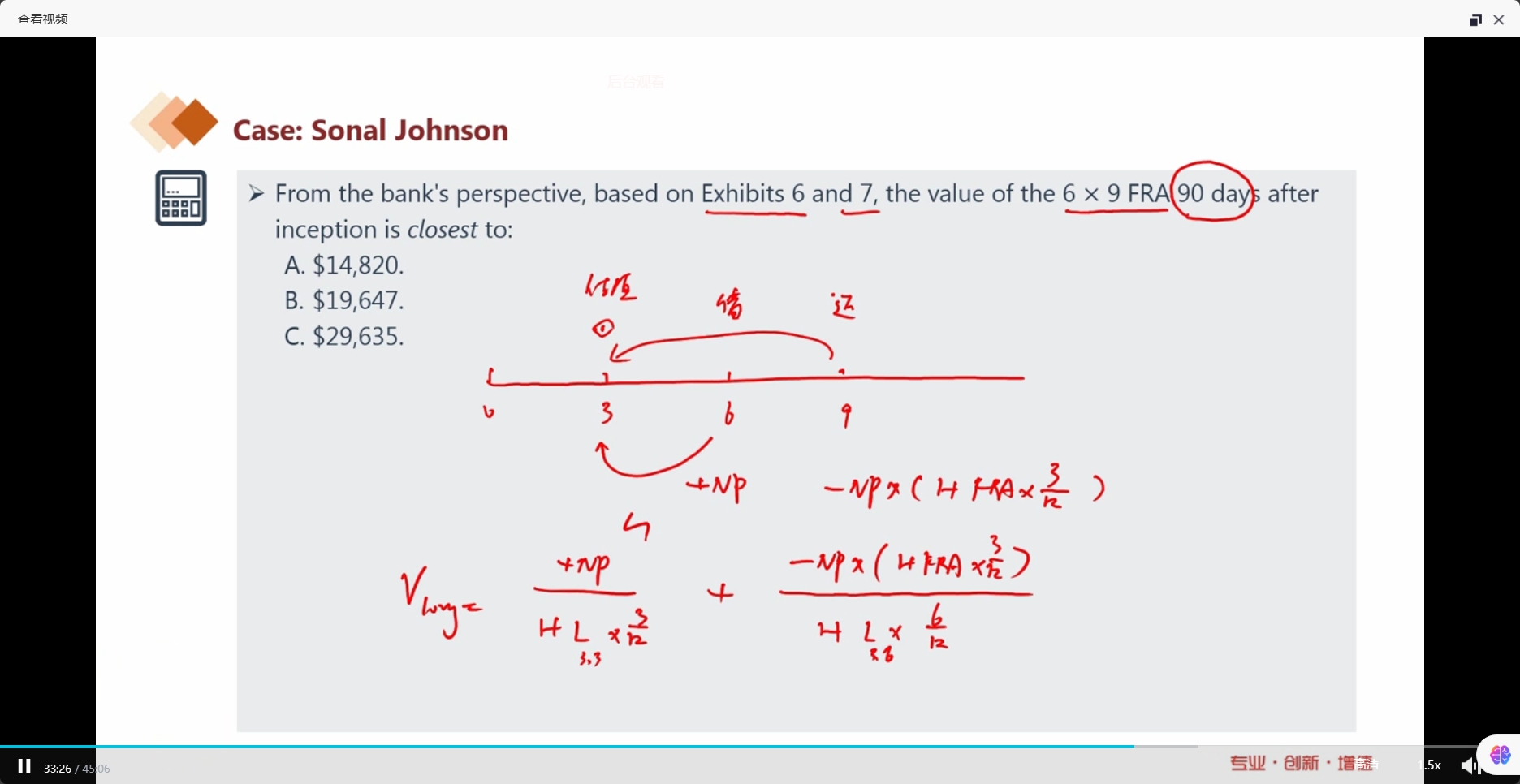 这种题目一定记得先画图,假设FRA对应的贷款真实发生了,然后用收到(6时点)和支出(9时点)现金流的时点到目前(本题为3时点)的MRR来分别对收入和支出的现金流进行折现,最后用收到现金流的现值减去支出现金流的现值得到当下时点的估值。