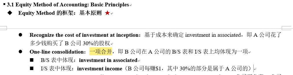 equity method,只在B/S中,确认一项:长期股权投资;同时在I/S中确认一项投资收益,其他科目都不用调整,也就是不用和子公司一起合并。