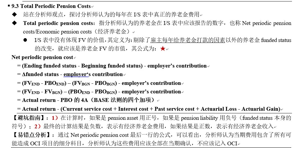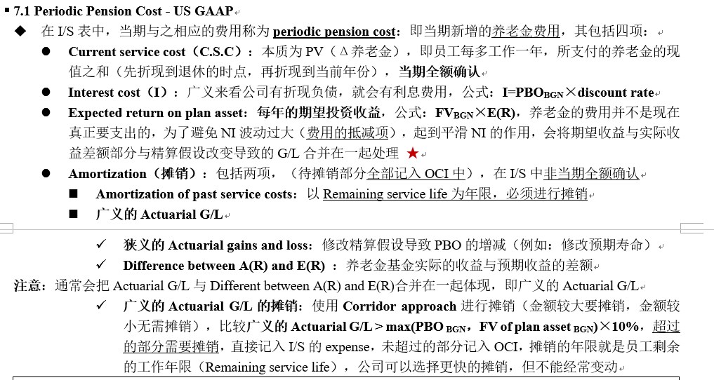 在I/S表中,当期与之相应的费用称为periodic pension cost:即当期新增的养老金费用,以美国准则为例,主要是4项,具体可以参考截图2