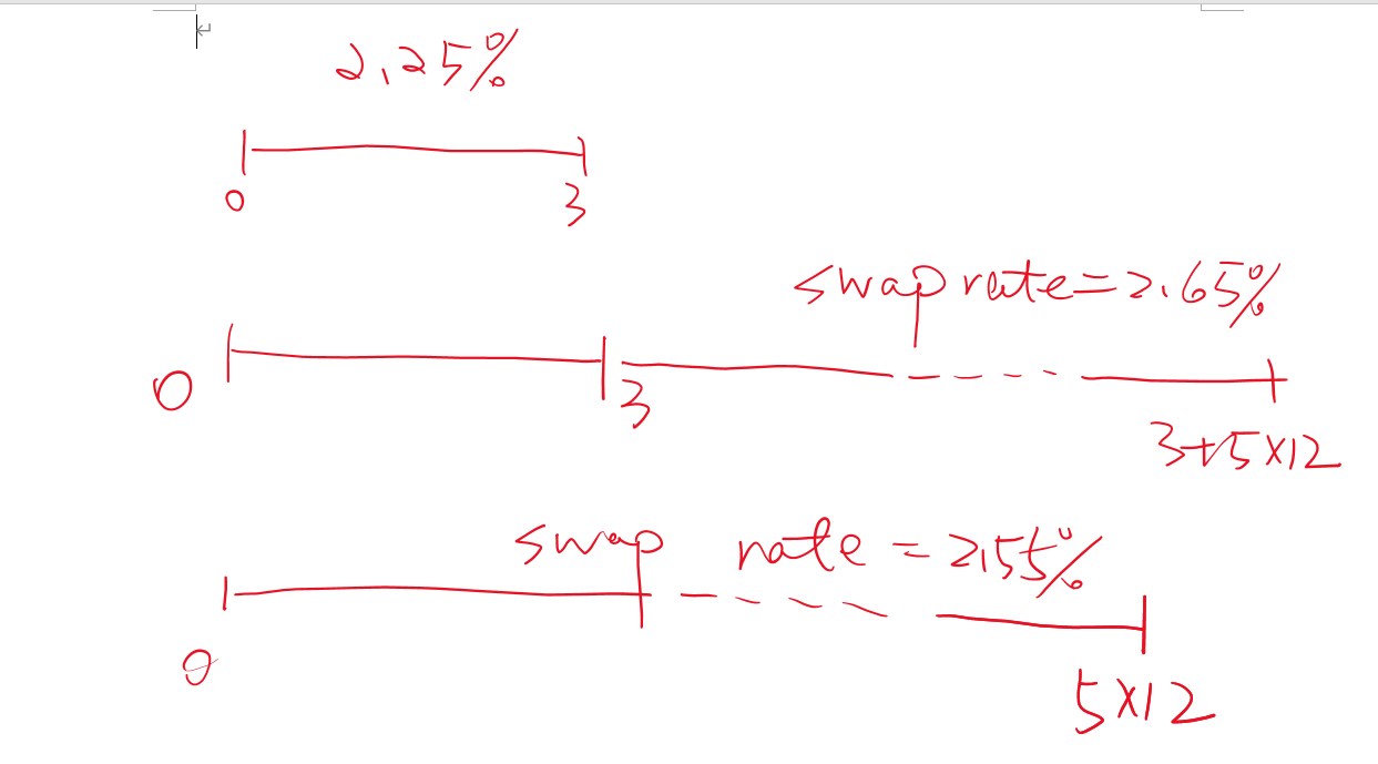 我们在B的分析方面,应该用即期利率2.25%对Swaption来估值,因为swaption还有3个月到期,在3个月时间点上的gain or loss应该往0时刻折现3个月,从3到0,应该是用0-3时间段的利率
