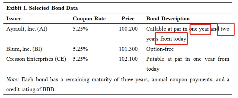 同学,你好!很简单,嵌入期权的债券中的期权会有一个观察期,就像本题材料表1给出的AI 中的期权只能在第一年和第二年行权。望采纳,谢谢!祝你成功通过考试呀!