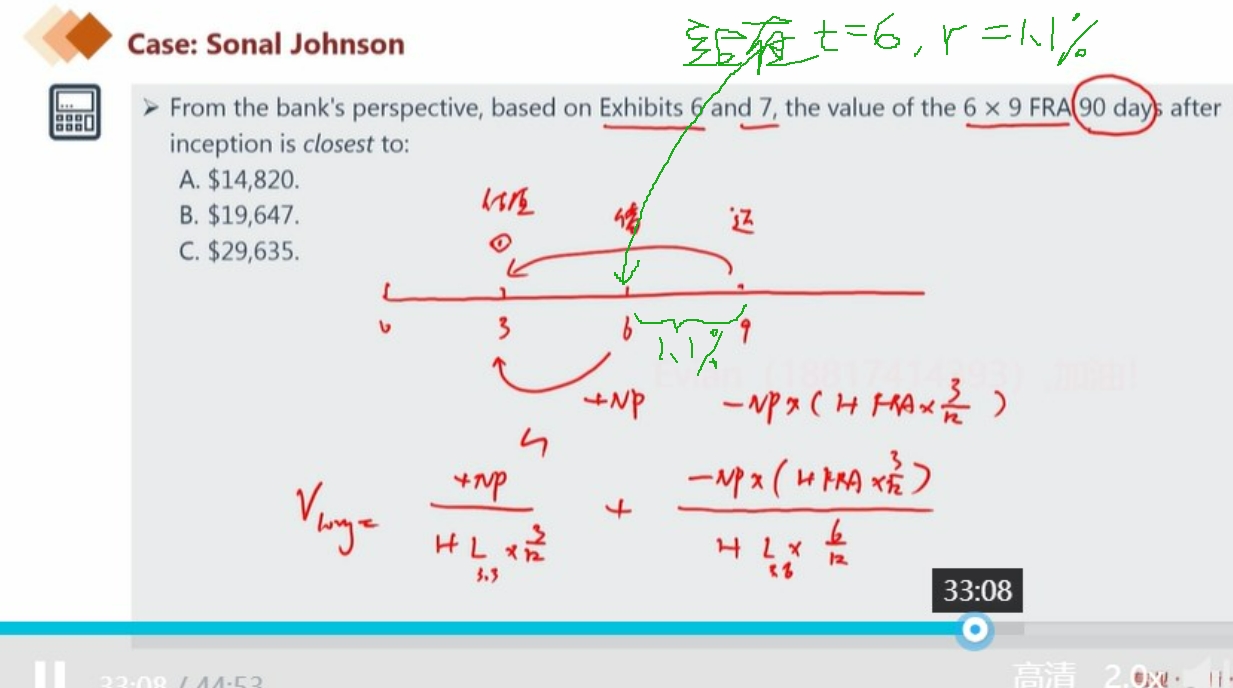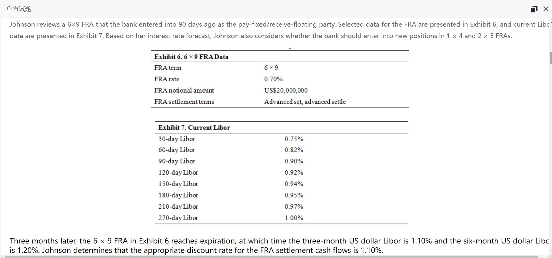 Johnson reviews a 6×9 FRA that the bank entered into 90 days ago,这个是题目信息。基于此信息,题目问的时间点是t=3,FRA的现金流发生在t=9,从t=9折现到t=3,如上图,所以用r是3-9时间段的折现率。 你说的1.1%是6-9时间段的利率。