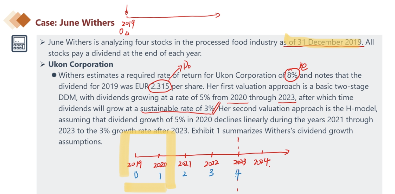都是按照年底算的,2021年是2020/12/31 - 2021/12/31,2022年是2021/12/31- 2022/12/31以此类推。题目中第一句话说june这个人从2019/12/31在processed food起这个行业分析四只股票