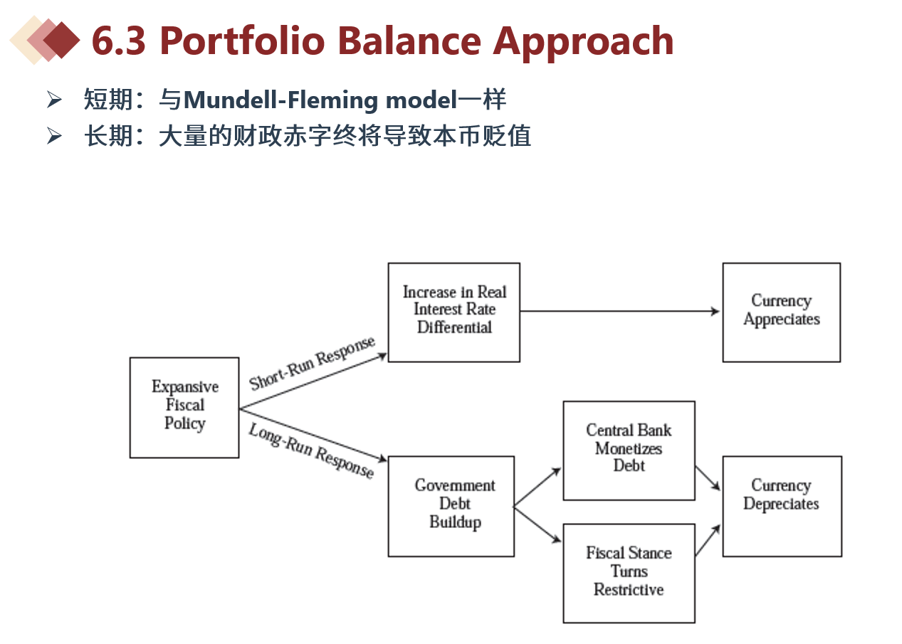 1. 这题知识点是下面第一张图。在长期,持续采用宽松货币政策会导致债台高筑,政府不得不转为紧缩的财政政策,这就降低了政府支出,使得政府融资减少,资金需求下降,利率下降,资金外流,本币贬值