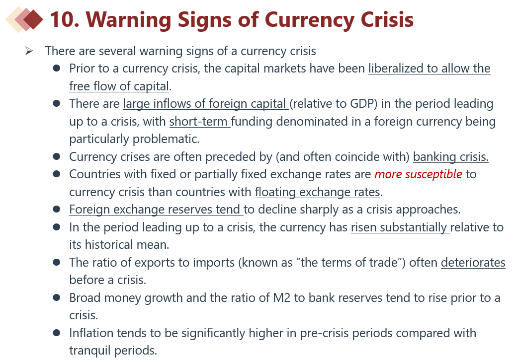 2. 这里是出自下面第二张图,不是说是否影响到实际利率或实际汇率,而是说三个prediction中,那些事货币危机的征兆。可以看出,broad money growth以及In the period leading up to a crisis, the currency has risen substantially relative to its historical mean,这两者都是货币危机的前兆。既然知识点本身并没有明确提及这个money growth以及汇率的升值是名义还是实际的,说明这一点不重要,我们只要记住广义货币增发以及本币大幅升值是货币危机的预警信号之一