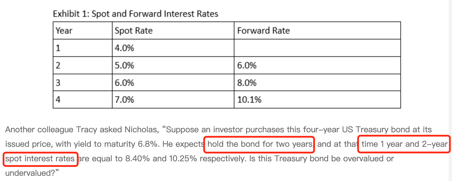 题目说的是该投资者目前t=0时刻认为他要持有两年后卖掉,那么对应卖掉时(t=2)的1年期和2年期的spot rate就是t=0时看到的第三年(图一中的2~3)和第四年(图一中的3~4)的forward rate了,所以用这时候投资者自己的期望和目前(t=0)时的forward rate进行比较。