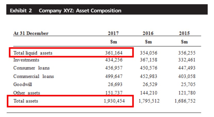 老师,我自己算的2017年的total liquid asset的比率是16.3%,不是18.7%。老师能看一下哪个数值对和为什么吗。