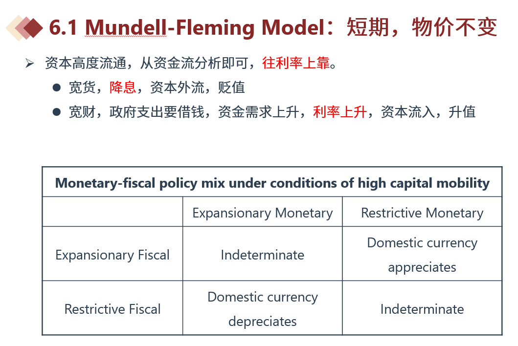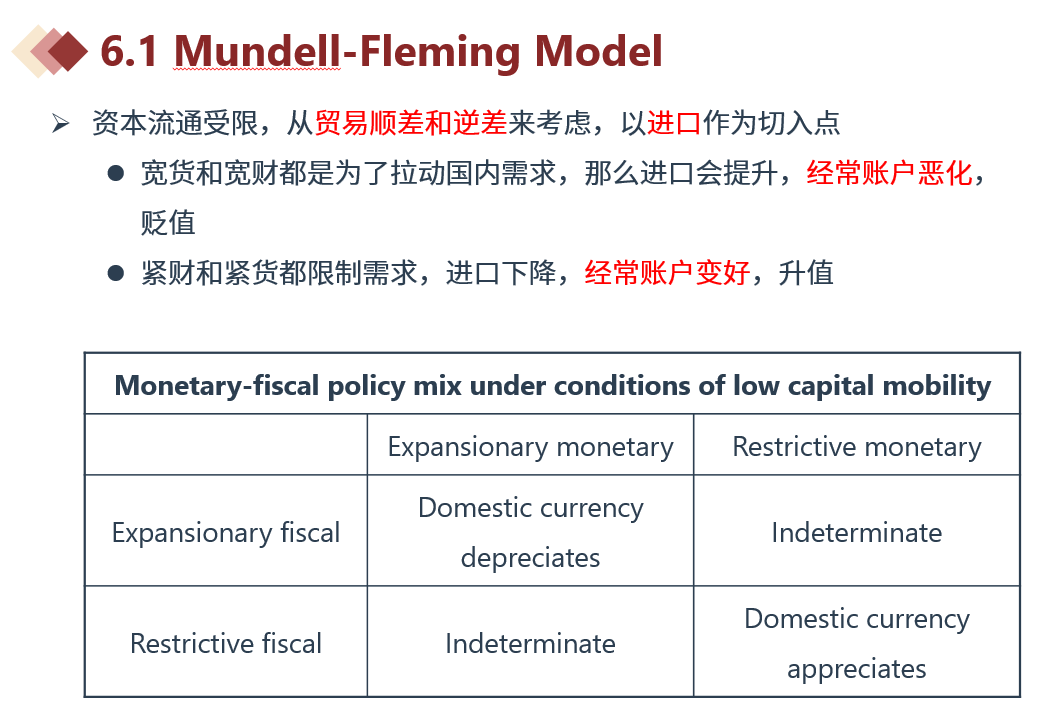 low capital mobility是限制了资本的跨境流动,在这种情况下就不需要从FA的角度去考虑汇率变动了,只考虑CA即可。可以参考下图,在low capital mobility的情况下,就直接往进口上面靠即可,进口上升则经常账户恶化,本币贬值;进口下降则经常账户盈余增加,本币升值,这样可以很快做出题目。
