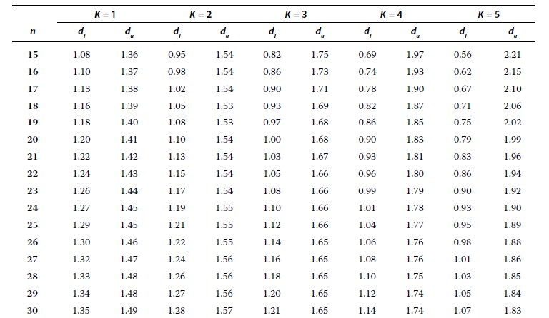 同学你好。DW检验关键值表如下图,根据自变量个数与样本数,查找对应的上下限。然后根据上下限划分为5个区间,最后看检验统计量值落在哪个区间进行判断得出结论。