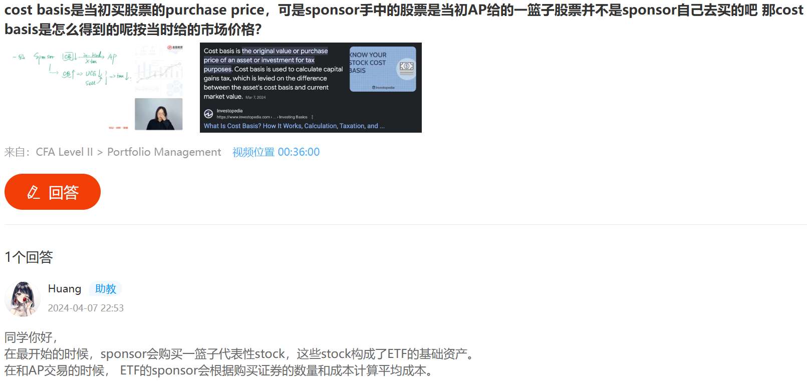 同学你好。1)请把别的答案讲的截图贴出来。ETF发行人与AP之间以物易物,AP将规定的一揽子股票给到发行人,发行人将ETF份额给到AP。发行人自己买股票干什么,那就没有AP的事了。AP会按照发行人的要求购买一揽子股票与发行人以物易物交换ETF份额,此时发行人手中就有股票了。AP也不是申购一次就好了,他会根据市场情况进行申购与赎回,因此发行人手中有多次申购收进来的股票,每次价格不一样。如果AP要赎回的话,发行人会将收进来成本最低的交给AP,这样可以避税,这就是视频中老师讲的过程。