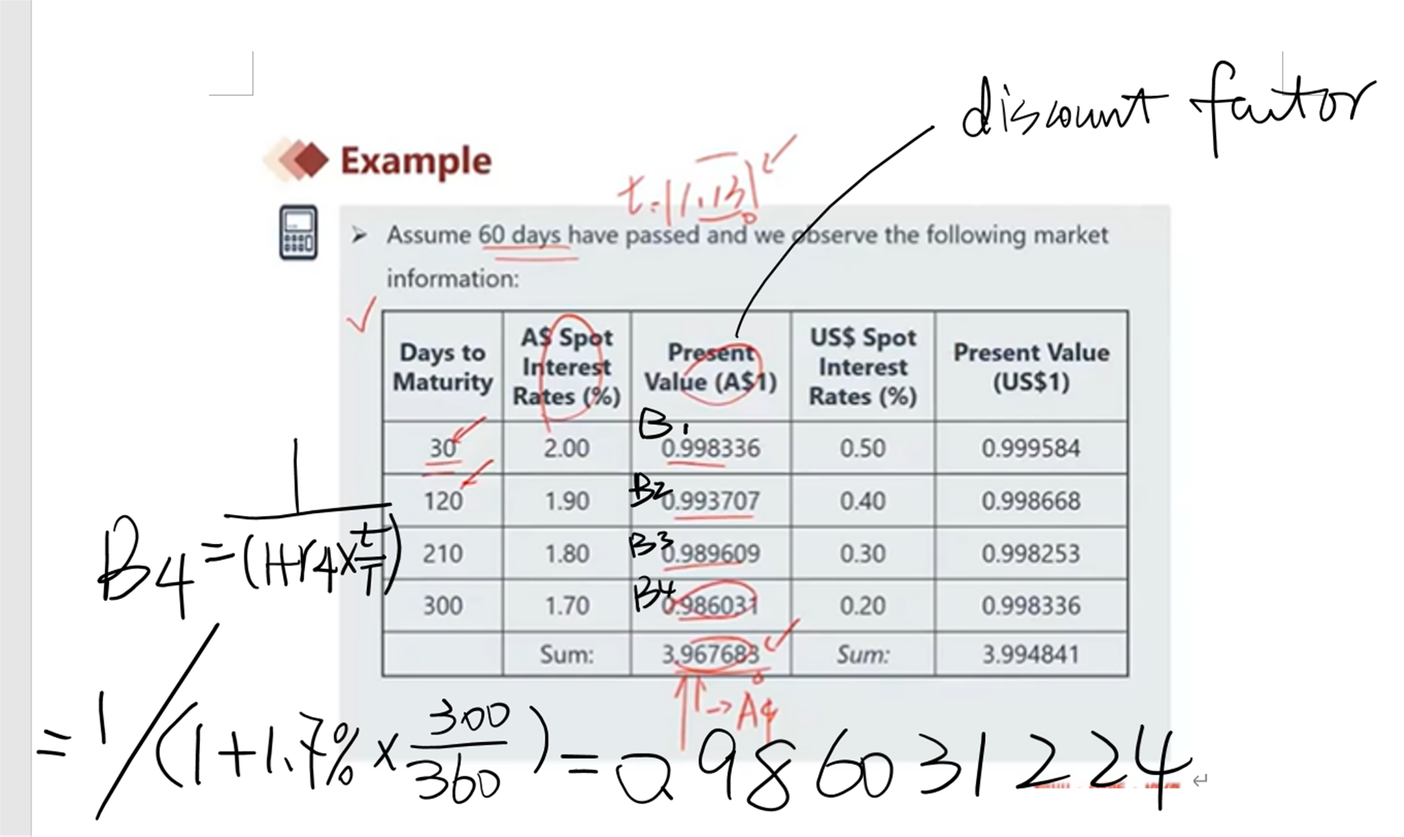 这里的B1´, B2´, B3´, B4´ 【需要】与前面表格中给出的30, 120, 210, 300天的spot rate和present value 对应起来。
