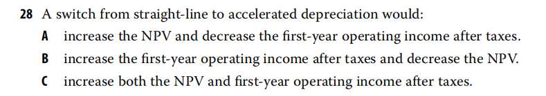 第19个reading课后题的第28题,把直线折旧费改为加速折旧法以后,开始年份折旧高,税少了,所以the first-year operating income after tax也应该是变高了啊,为什么不选C?
