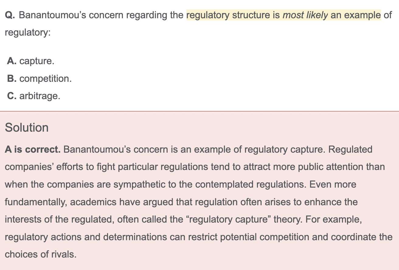 老师,官网“Sagara Case Scenario”这一题,(1)为什么选择regulatory capture呢?这个不是基于管理者对于管理范畴的认知薄弱而造成的吗?(2)题干说“Banantoumou is worried that companies have learned to preemptively cooperate with their regulators with the expectation that the regulators will favor their point of view over a competitor’s.”即B君担心公司已经学会了先发制人地与监管机构合作,期望监管机构会支持他们的观点,而不是竞争对手的观点;那么,这不是更偏向于“regulatory arbitrage”吗?(3)能否总结归纳一下,如何区分regulatory capture, regulatory competition和regulatory arbitrage?有劳老师逐一解答,谢谢。