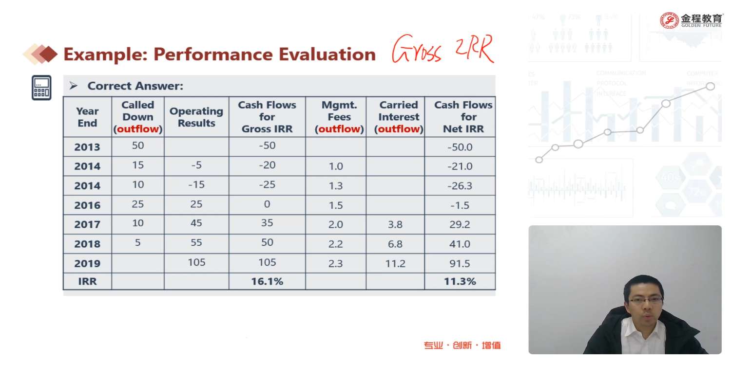 老师,这里计算gross IRR时,50的called down是发生在2014年,为什么在计算IRR时候算在2013年呢?谢谢