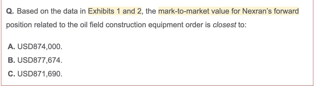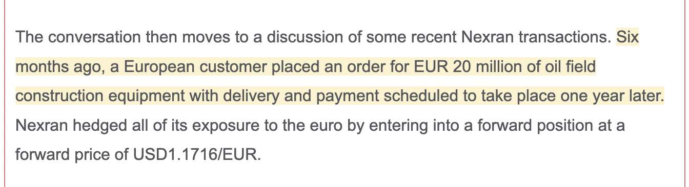 查看试题 已解决老师,(1)请讲解一下官网“Nexran Enterprises Case Scenario”这一题。(2)另外,截图二的题干中,一开始签订的合约(6个月前的那份)是long还是short EURO呢?因为我没看明白这个,无法得出盯市价值第一步“签订反向头寸合同”的对应汇率(不知道是+bid还是+ask的forward point)(3)如果该题选项的货币从标价货币USD改成基础货币EUR的话,那么解题步骤会从哪里开始产生变化呢?(4)如果题目提供给我们的本金不是以基础货币EUR标价,而是从标价货币USD标价的话,那么解题步骤会从哪里开始产生变化呢? 我记得之前问过类似问题,只是可能因为延考,我的系统更新了,几个月前的提问记录找不到,有劳老师再次逐一详细讲解,谢谢。