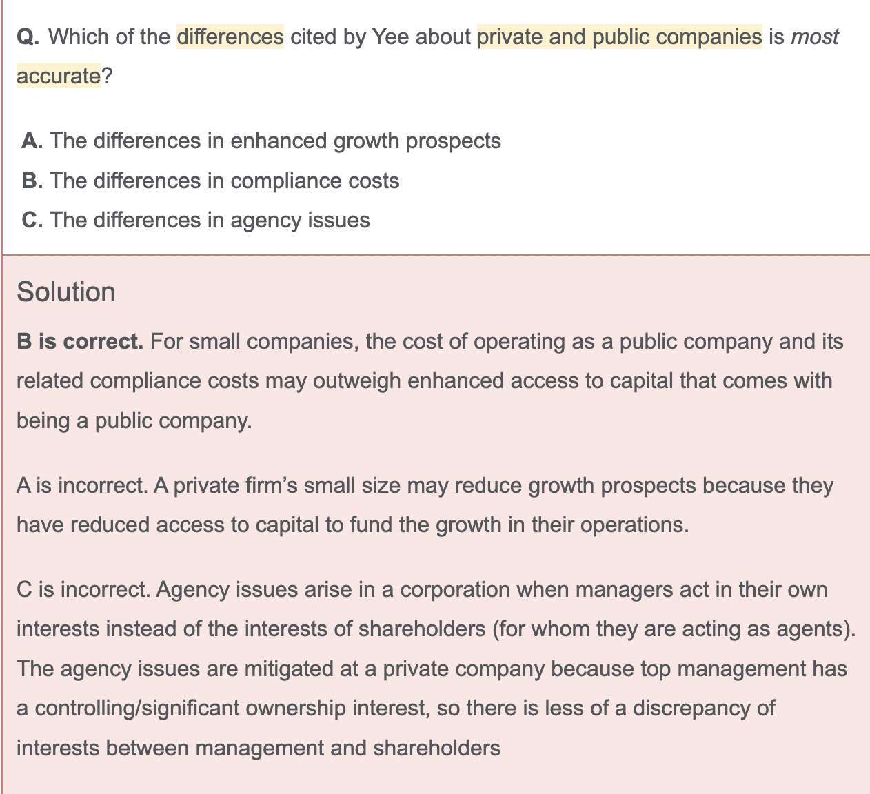 老师,官网“Bryan Yee Case Scenario”这一题,我能理解3是正确的,只是不能理解2为什么不正确?我的理解是一般中小企的规模较小,管理层一般身兼多职(包括股东),那么较于上市大公司,agency problem在中小私企是更明显的。