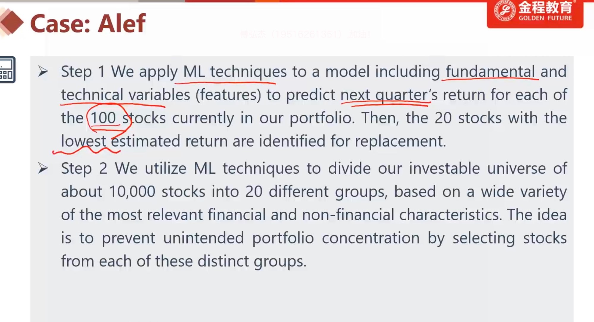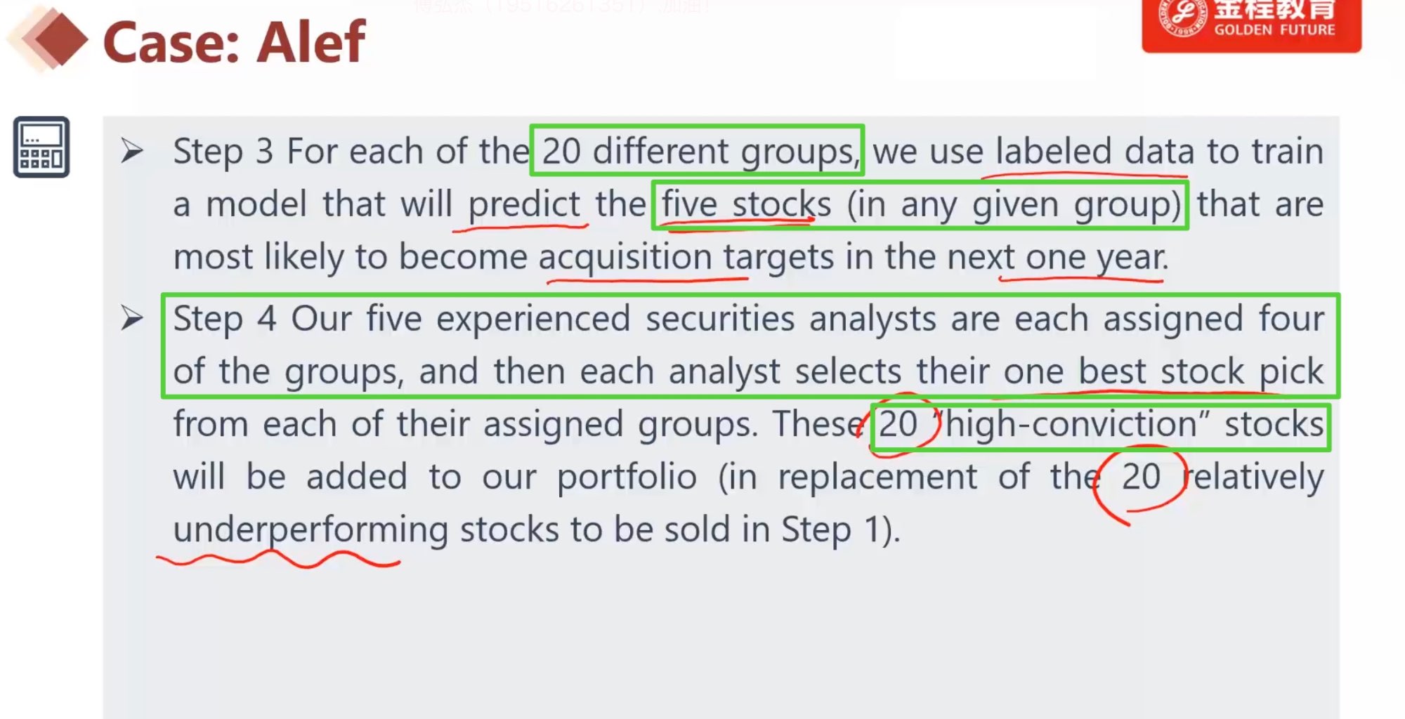 老师,问下step3和step4是不是矛盾了呀? step2:1w支股票分成20组。 step3:20组里面每组都选5支股票,总共选出来100支股票。 step4:5位分析师,每人负责20组中的4组,每组选一支表现最好的,最后选出20支股票。 按照step3的表述最后选出来是100支股票,但是按照step4的表述最后选出来是20支股票?还是我对英文表述的理解上有问题呢?