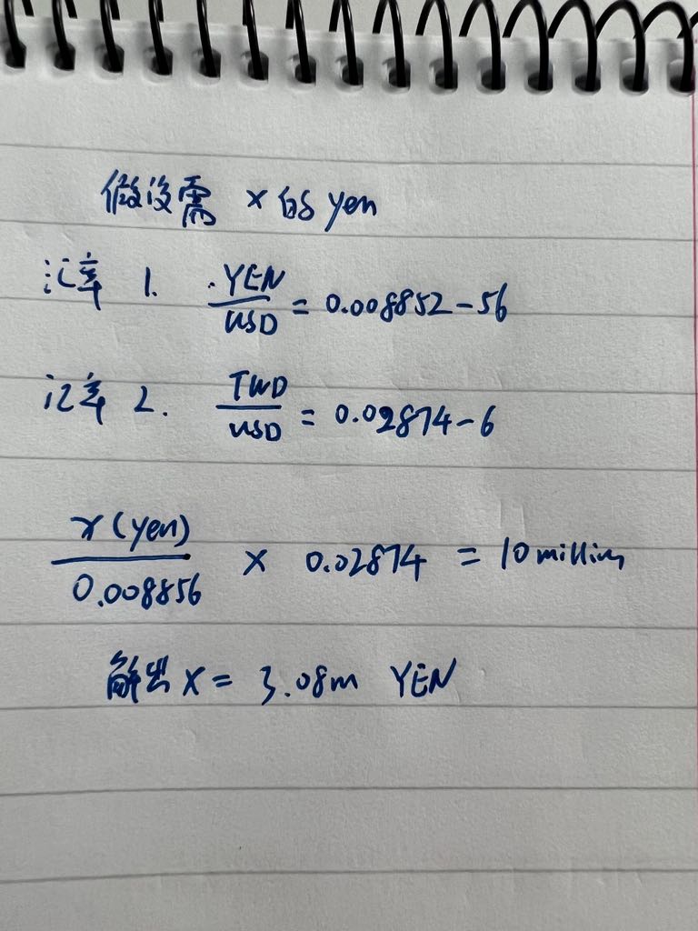 百题经济学第五个case第一题,老师可以看看这个解法错在哪里了吗?假设用x的yen去换10m的TWD,我感觉方程没问题但算出来不对。