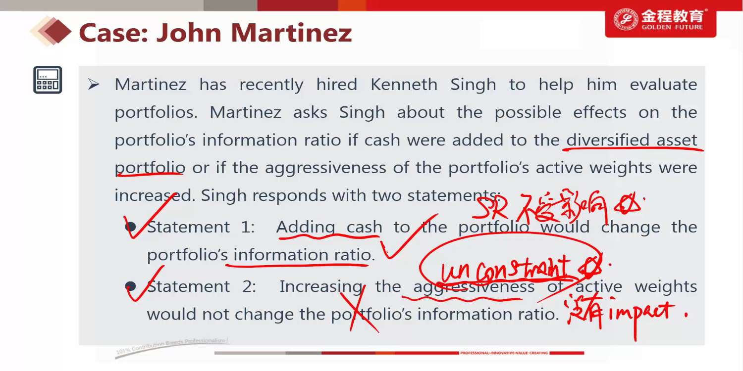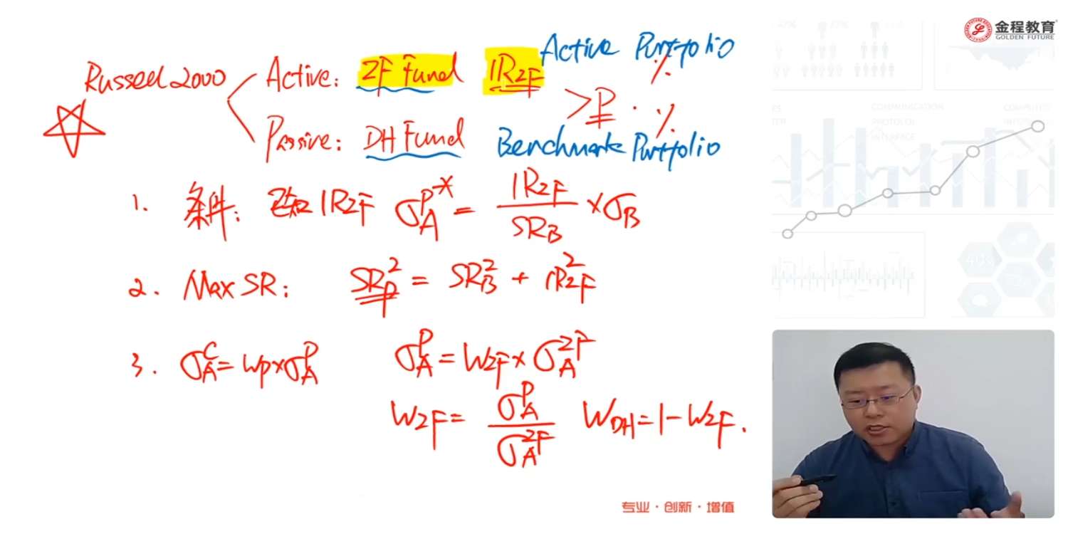 已解决老师,请问下,我有两个问题,1. 所谓的超额回报,是指Fund1的相对于benchmark的超额回报对吗?比如我benchmark里有60%股票,40%债券,那我fund1是70%和30%,但是股票的种类和债券的种类都是相同的,比如都是股票都是茅台+特斯拉+比亚迪然后债券都是某公司债。只是各个部分权重会不一样(大类权重(AS)+个股权重(SS)),从而相加得到的activereturn。2. 但是后来又说,一个组合里,可以加上benchmark的权重,就是说我这个组合相当于是70%fundA+30%benchmark.这样的话,其实是不影响新组合的IR的,IR还是等于fund1的IR,但是会影响新组合的SR以及σA对吗?