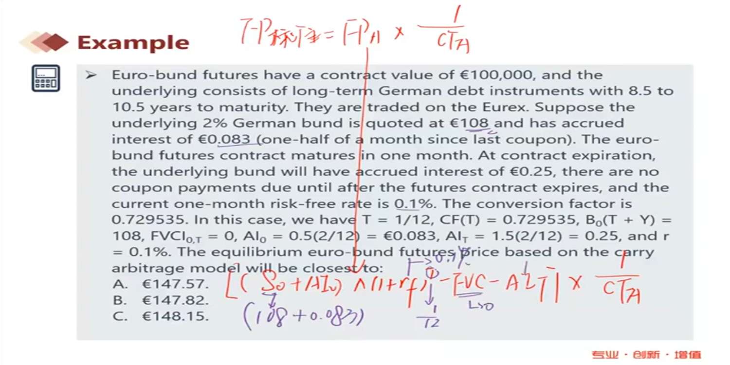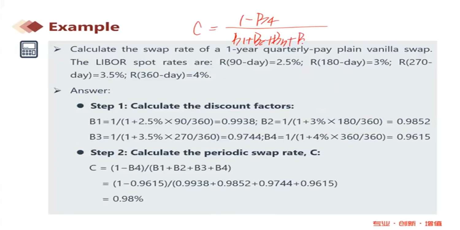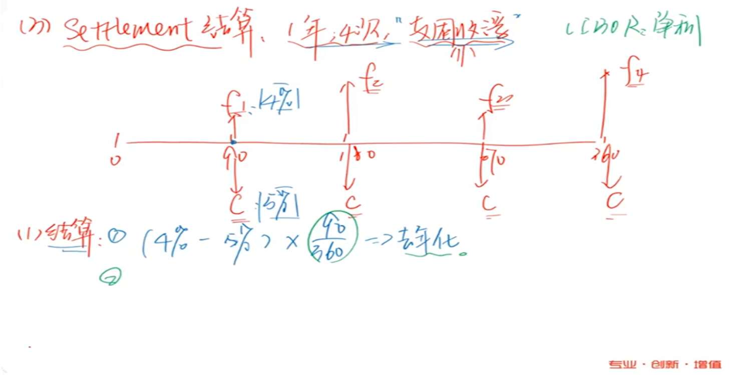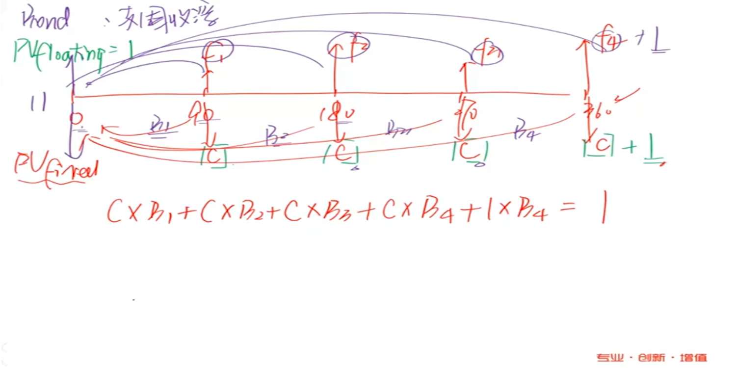 老师,我的理解:C*B1是第一个C(90天时点)的coupon金额,C*B2是第二个C(180天时点)的coupon金额,C*B3, C*B4同理,这个理解对吗?如果对,那不是不同时间点的现金流不能直接加减吗,不是应该要折现到同一时点吗?这里为什么没有折现呢?