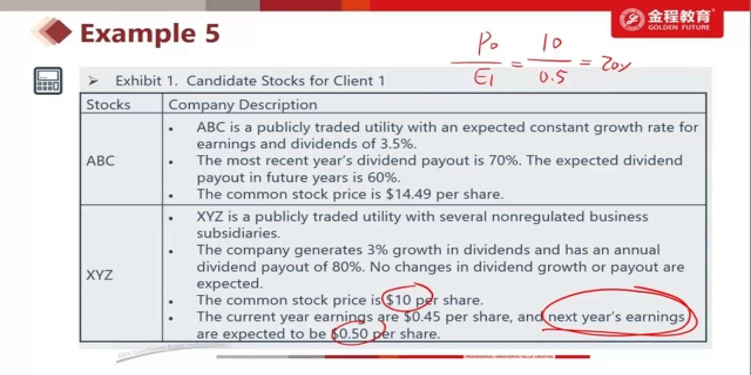 这里如果不用P/E来算,也可以直接算P0再和市场价格比较?P0=D1/r-g, D1是0.5x80%,r-g是4%,算出来股价就是10。但我不明白的是如果把D1换成D0(1+g),带入数字为0.45x80%(1+3%),再除以r-g,股价就小于10了,不知道错在哪里