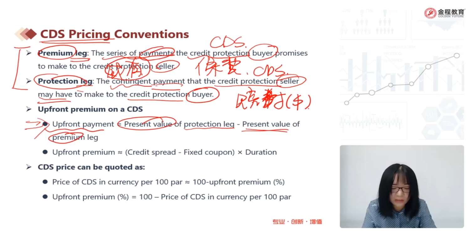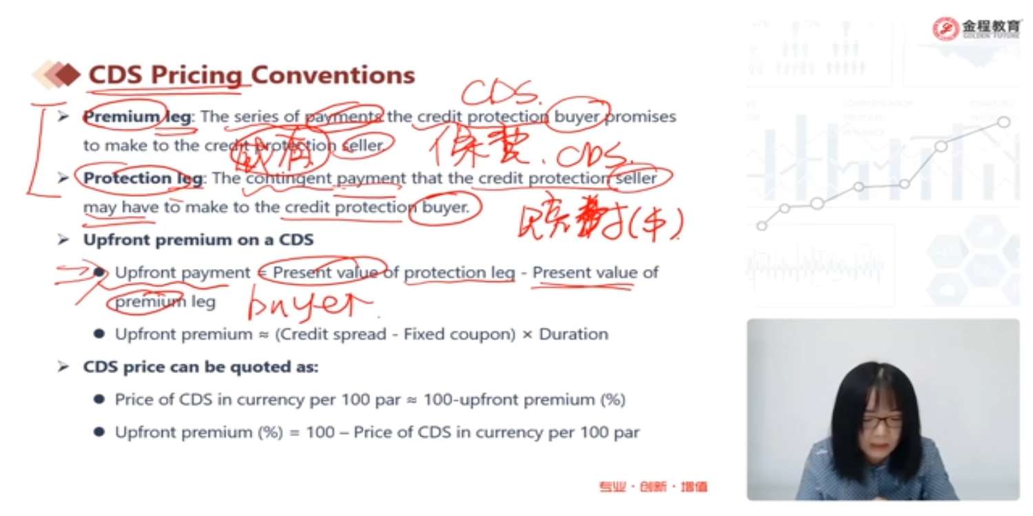 我觉得老师这里为了让大家理解,又讲到质量和价格的问题,好像更饶了。我可不可以简单记忆:这里计算的是CDS price,直接带入公式就可以计算出:Price of CDS in currency per 100 par ≈ 100-upfront premium (%) 由于是卖家支付upfront premium,所以是负的。100 -(-2)=102。这里只要是买家支付,减去的就是+2,如果是卖家支付那减去的就是-2