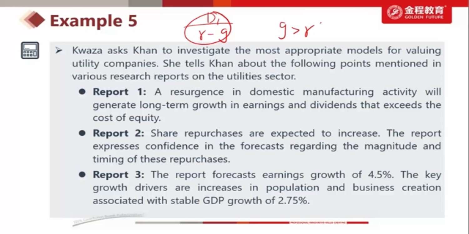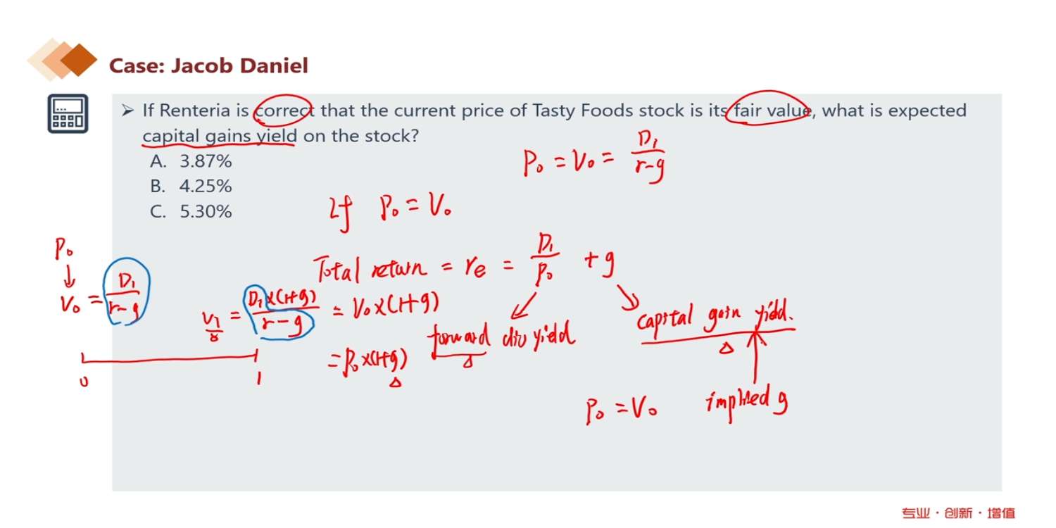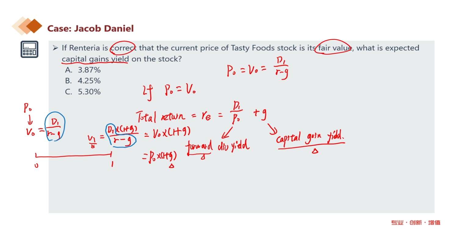 在公允定价情况下,total return=要求回报率re=div yield +capital gain,那么这里也可以用re-d1/p0来求出capital gain啊,这样求出来等于5.3%
