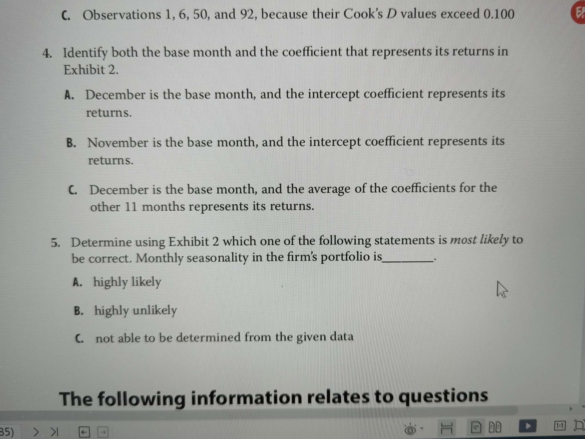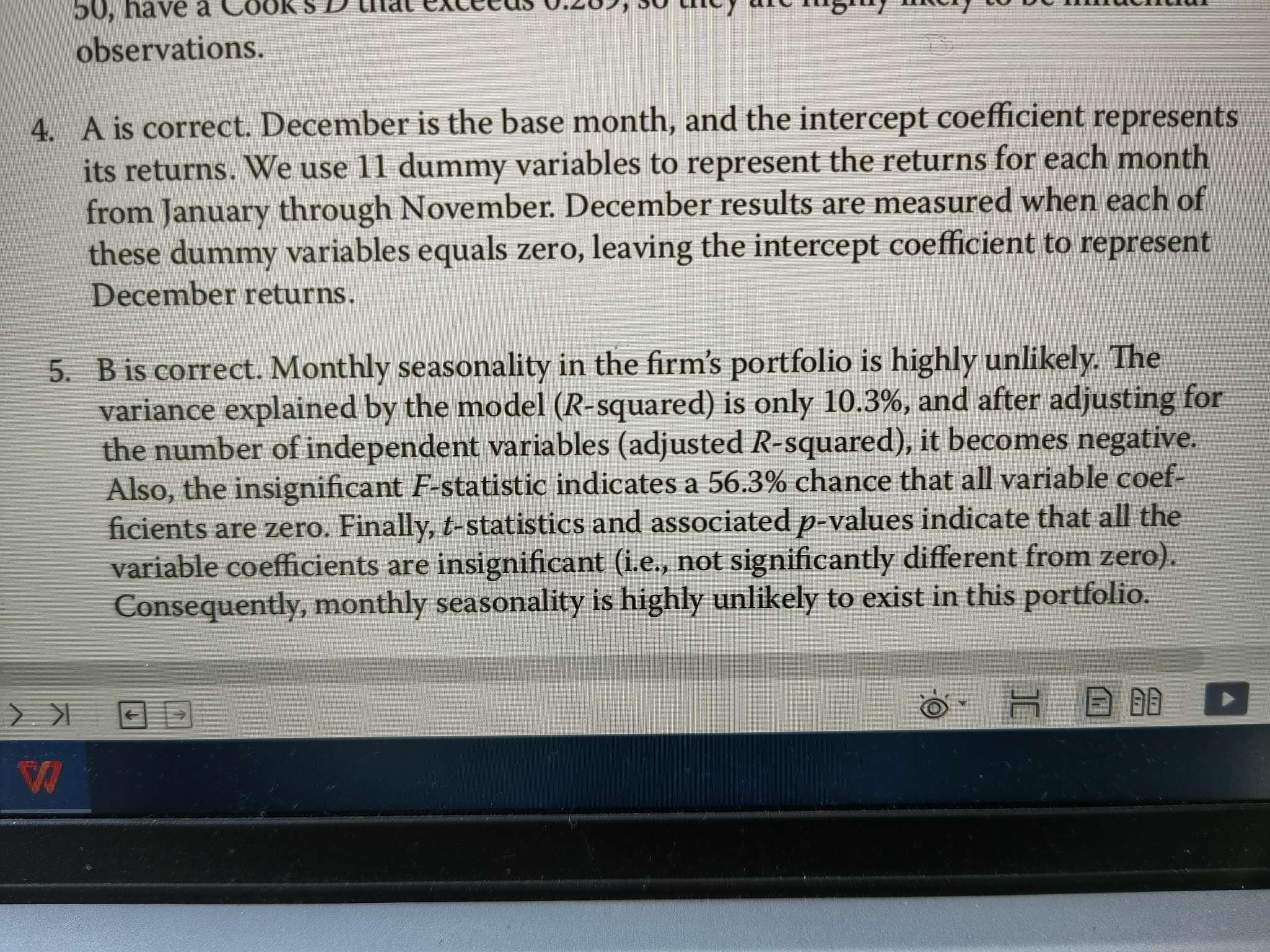 原版数量104页,5题,monthly seasonality如何理解?是不是季节性影响的意思?如果没影响,则系数显著不为0? 另外,答案各种解释是不是有矛盾?F检测,显然拒绝,p很小,按理也是拒绝,而t很小,不拒绝。答案解释没懂