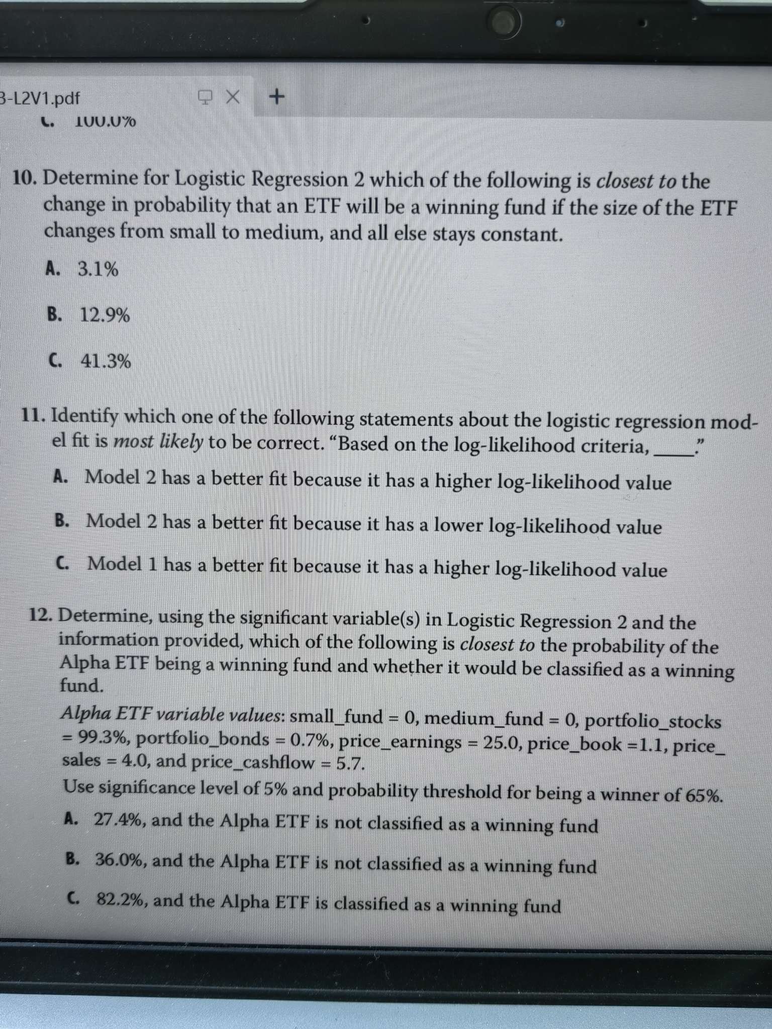 数量107页,10和12题 10. 当从小到中变化时,为什么不是系数直接相减,-0.3509-(-0.4794),得出e的指数变化,从而计算出来,答案是各自计算出p再相减。 12.我是全部数据代入计算出p,没有答案;而答案先从p排除所有系数显著为0的,只代入显著不为0, 这该如何理解,那这个log odd公式这么多系数意义何在,