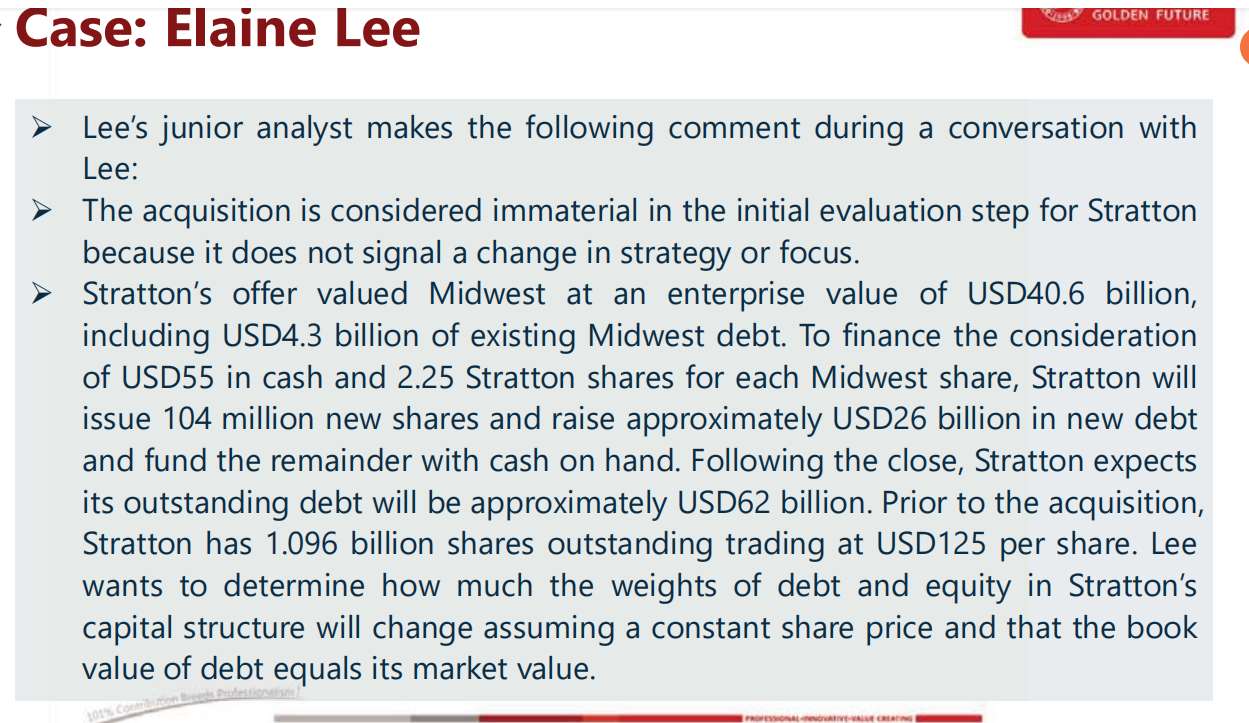 case Elaine Lee,第3题,①题目中说的following the close是什么意思,也没说明是指收购和发债之后呀?②股票单价*股票数目,不是指整个企业的估值吗,为什么在这道题里只是equity的价值?③被收购企业的价值40.6在这道题里没有用吗,收购后对母公司价值没有提高吗,如果要用母公司收购前价值+子公司价值,该怎么算