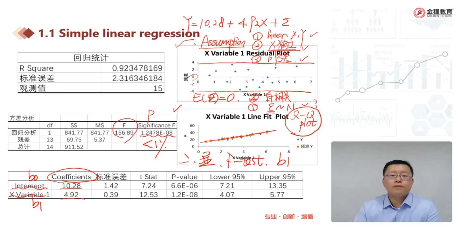 查看试题 已回答module4的第5题,判断月度的季节性,看F的P value0.563小于5%,即可得出拒绝原假设,显著不为0。但是看原版书的答案内容, the insignificant F-statistic indicates a 56.3% chance that all variable coefficients are zero. Finally, t-statistics and associated p-values indicate that all the variable coefficients are insignificant (i.e., not significantly different from zero). Consequently, monthly seasonality is highly unlikely to exist in this portfolio.是怎么判断T检验和联合Pvalue表明所有系数都显著不为0的?