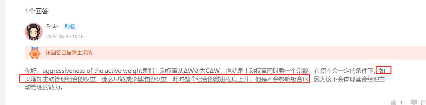 到底该如何理解aggressiveness of active weight?视频中老师推导的过程表述意思是降低积极组合的权重,调增benchmark的权重,而答疑平台上面则说是降低benchmark权重,提升积极组合的权重,是矛盾的。更关键的是,对于IR是否造成影响,我是从经济含义上来理解的:调增benchmark权重相当于无脑复制指数收益,确实不能够代表基金经理投资能力,但是反过来说,我把有限的资金,调高积极投资,减少benchmark的投资,这就是在对IR产生影响呢,不知道我理解哪里有问题