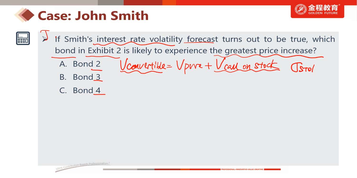 老师,图中该问的A选项,讲师说利率的波动对convertible bond 无影响,股票价格变动对其有影响,但是基础课上说如果是bond risk return特征的convertible bond,利率的波动对其有影响,股票价格变动对其没有影响。这两种说法不是 冲突了吗?怎么理解,谢谢