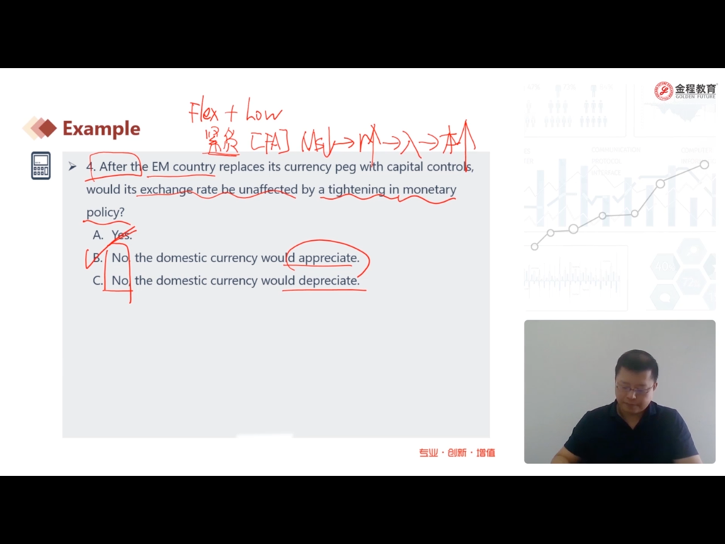 - 老师,第三题答案的意思是:1.因为宽松的货币政策,导致加元利率下跌,导致加元贬值?2.但是,如果利率下跌,也就是分母上的百分比下降,不是会导致价格上升吗?。3.从而短期看是depreciation,但是长期来看,会回归到均值,所以是appreciation?