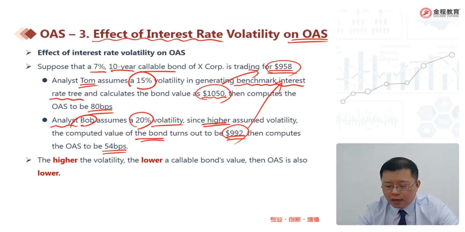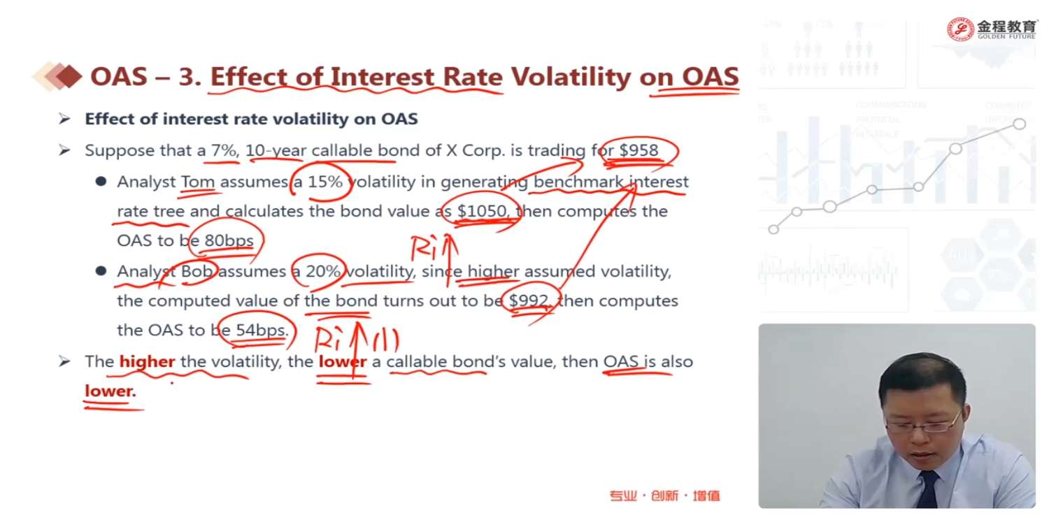 麻烦老师帮忙解析一下:第一句7%的,10年callable,价格是958,是指市场上,相当于定价准确的,callablebond的价格是958?第二句话,在15% 波动率的时候,用benchark算出来,得到的国债二叉树算出来的,价格是1050--请问这里的1050是含权还是不含权的国债价呢(或者说从哪里体现出是否含权呢)?在Vcallble=Vpure-Vcall中,1050等价为哪个数值呢?