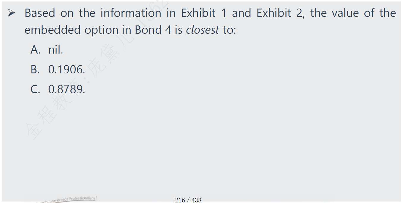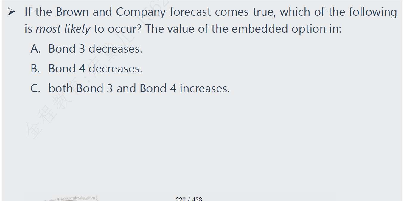 题目中问的是Vcall和Vput的价值变动。当利率下降,Vcallable的价值上升,Vputable的价值下降。我的解题思路是:Vstragiht价值不变)-Vcallable(价值上升)=Vcall(下降),Vputable(下降)=Vstragiht(价值不变)+Vput(下降)。为何不是两个的价值都是下降?题目中的思路,是直接根据利率判断Vcall和Vput的变动,为何不用带入公式进行计算?