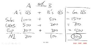 老师您好,我不太理解在combination这个章节51Min中老师 举的例子 .为什么A收购了 80%的B,他们最后的归母净利润是240?我理解的是收购了B的百分之80,不应该是A公司NI100%的200与B公司NI80%的100之和280吗?