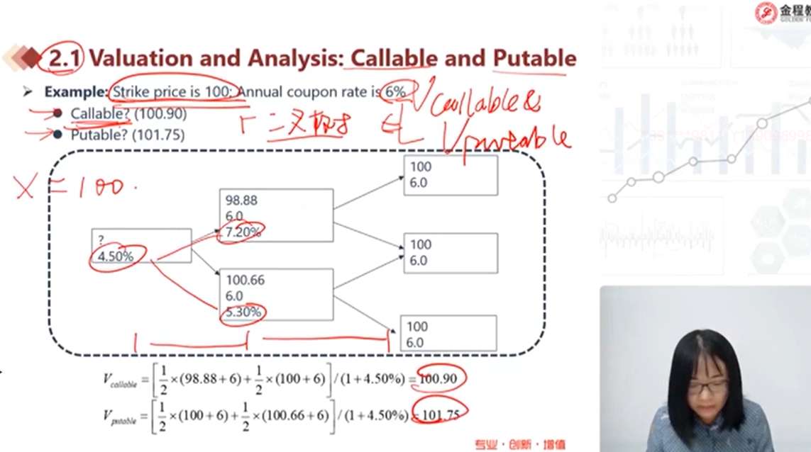 为啥这里求callable债券估值的最后一步时,求出来值是大于100的,并没有说取不到;而前一步1时间点的时候,大于100的说取不到,用100代替呢?最后一步是不是也应该取不到,最后取100
