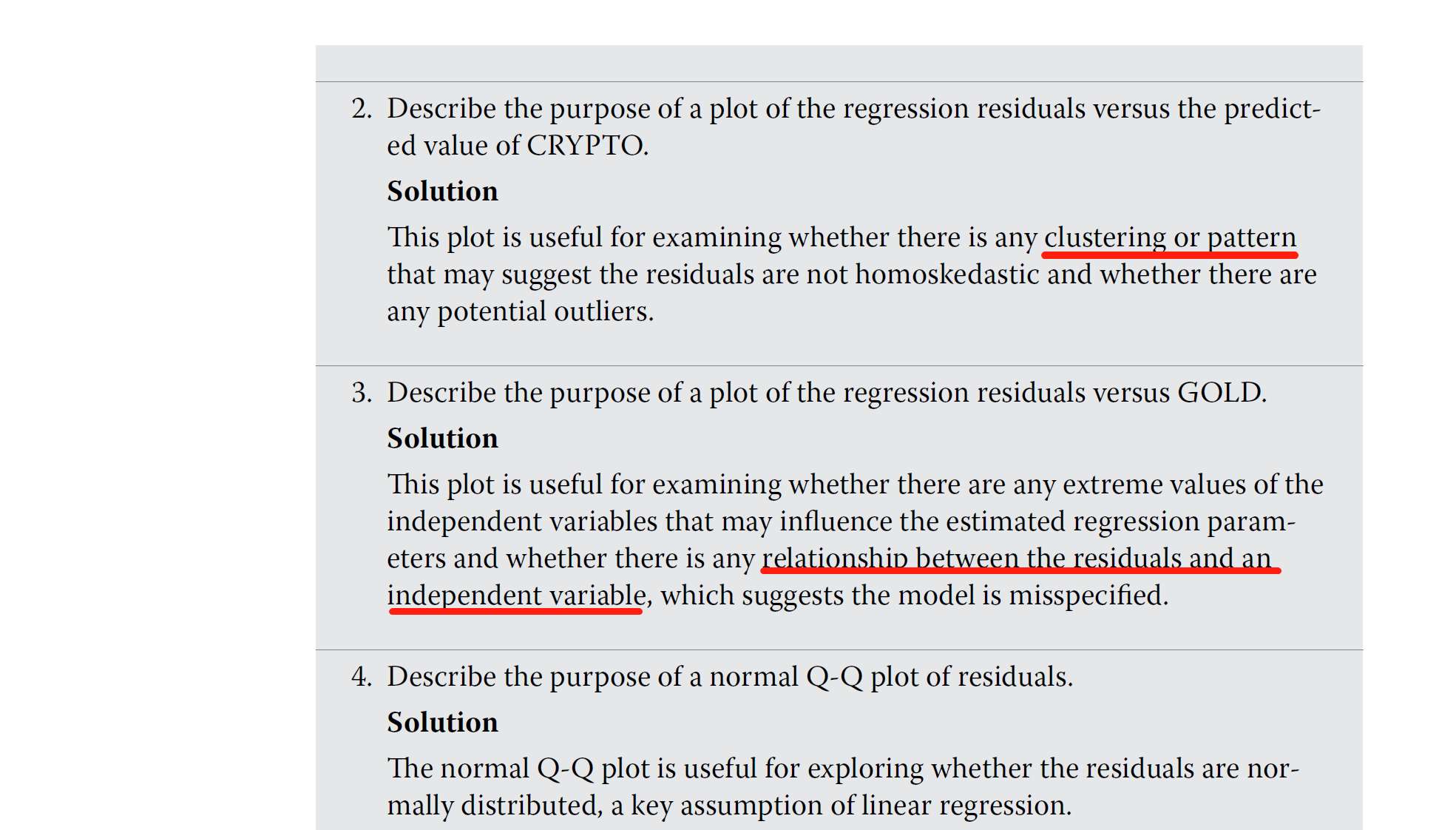 书上第18页的例题,第2题是残差和Y的residual plot,目的是检验是否有同方差吧?这段话里的pattern怎么理解啊?第3题是残差和X的residual plot,目的是为了检验自变量和残差之间的相关性,其实就是为了检验是否违反残差之间的相关性的假设吧?